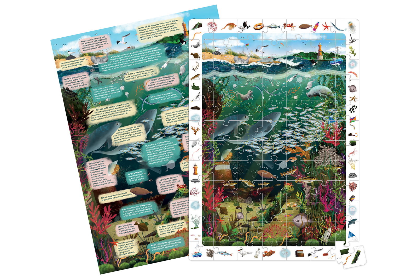 Edukacyjny zestaw zawiera dużą 84-elementową układankę oraz dwustronny plakat edukacyjny z ciekawostkami o tym, co dzieje się na dnie polskiego morza. Pełna humoru ilustracja i dostosowana do wieku tematyka inspiruje do zdobywania i pogłębiania wiedzy na temat środowiska i zachodzących w nim zjawisk. Zabawa w wyszukiwanie szczegółów z ramki rozwija spostrzegawczość i daje ogromną radość odkrywania. Wiek: 5+