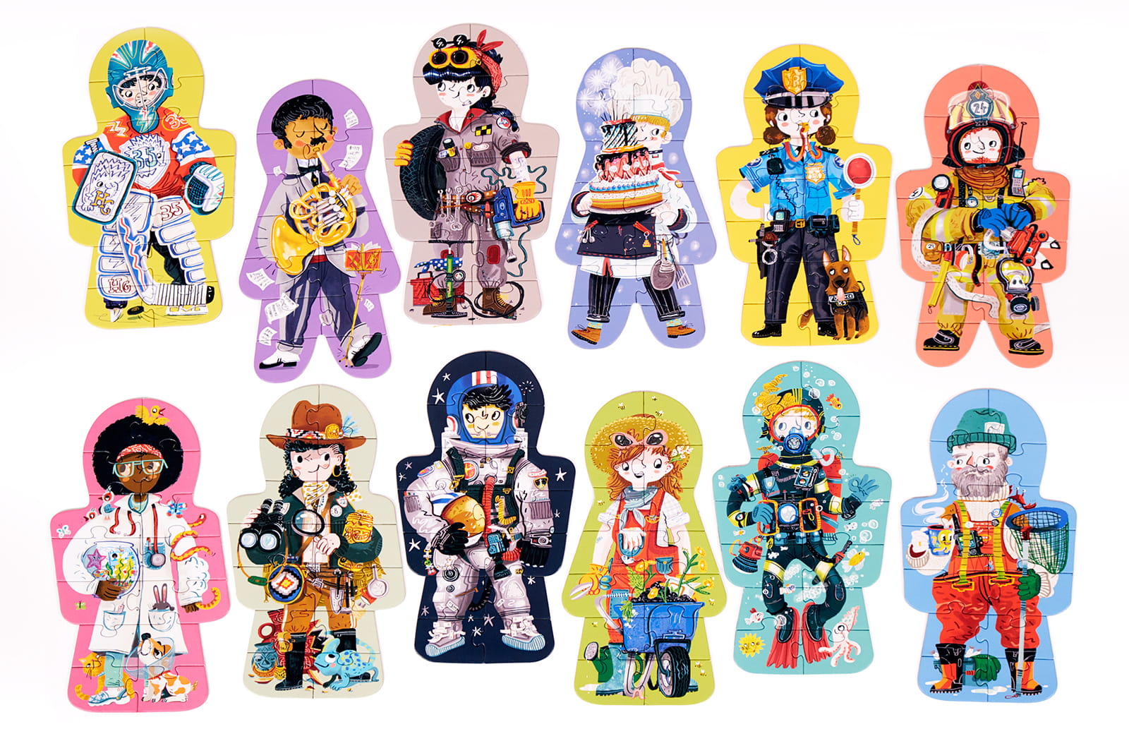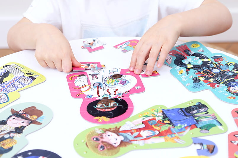 Edukacyjny zestaw puzzli pozwala dzieciom poznać 12 różnych zawodów i inspiruje do rozmów o pracy i zainteresowaniach.