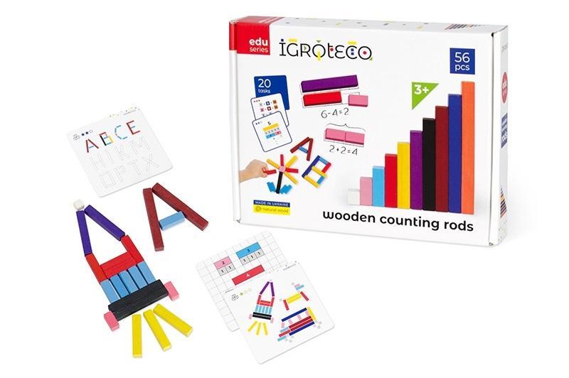 W zestawie: 56 drewnianych patyczków w 10 różnych kolorach, różniących się długością, o przekroju 10 x 10 mm. , 10 dwustronnych kart z zadaniami o różnym poziomie trudności, funkcje: tworzenie mozaiek, nauka liczenia, poznawanie liter alfabetu, wym. Opk: 23 x 4 x 17,5 cm., 3+