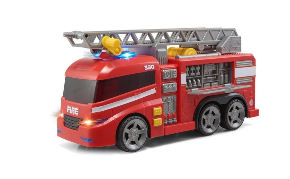 Duży samochód straży pożarnej, stylizowany na pełnowymiarowy pojazd. Zabawka posiada ruchomą drabinę do ręcznego obracania oraz otwierany bok. Samochód wyposażony jest również w realistyczne dźwięki i migające światełka, a uruchamia się je poprzez naciśnięcie przycisków umieszczonych na górze pojazdu.