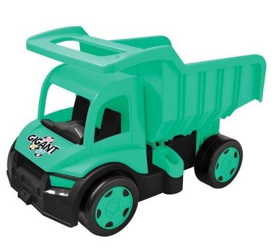 Gigant Wywrotka w kolorze miętowym to fantastyczny, duży samochód o długości 55 cm. Pojazd posiada zaczep z przodu (możliwość zamontowania sznurka, linki do ciągnięcia) i z tyłu. Ogromna wytrzymałość (nośność do 150 kg) gwarantuje wspaniałą zabawę.