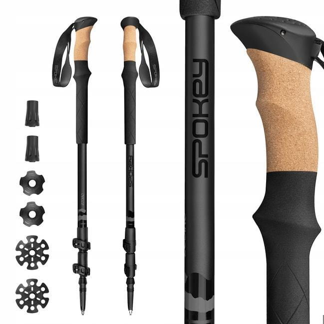Kije trekkingowe wykonane z wytrzymałego z aluminium. Trzysegmentowa konstrukcja z regulacją długości w zakresie od 105 do 135 cm umożliwia łatwe dopasowanie kijów do wzrostu użytkownika. Po złożeniu do minimalnej wielkości zajmują niewiele miejsca. Kijki zakończono widiowymi grotami odpowiedzialnymi za trwałość i wykazującymi podwyższoną odporność na ścieranie. Uchwyty z korka połączone z wysokogatunkową pianką EVA zwiększają komfort użytkowania podczas dłuższych wypraw. Dodatkowym atutem jest system regulacji paska Fast Fit, który umożliwia szybkie i łatwe dopasowanie do nadgarstka. W zestawie znajdują się gumowe końcówki do marszu po twardej nawierzchni oraz wymienne talerzyki na sezon letni i zimowy.