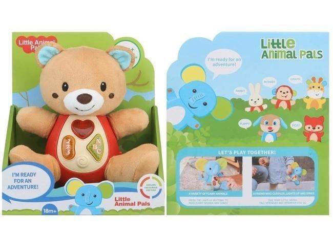Poznajcie pluszowego misia z kolekcji "Little Animal Pals" - idealnego towarzysza zabaw i przytulania dla najmłodszych! Ten interaktywny miś, zaprojektowany z myślą o dzieciach powyżej 18 miesiąca życia, to prawdziwa skarbnica sensorycznych doświadczeń. Jego brzuszek kryje podświetlane przyciski, które, po naciśnięciu, odtwarzają różnorodne, zabawne dźwięki oraz wesołe piosenki, stymulując rozwój słuchu i zachęcając do zabawy. Miś jest nie tylko źródłem rozrywki, ale także niezastąpionym przyjacielem do przytulania dzięki swojej niezwykle miękkiej i przyjemnej w dotyku fakturze. Grafiki na opakowaniu sugerują interakcje z innymi zwierzętami z serii, co może inspirować do kreatywnych opowieści i rozwijania empatii u dzieci. "Little Animal Pals" to nie tylko zabawka, to przyjaciel, który zachęca do odkrywania świata dźwięków i przygód.