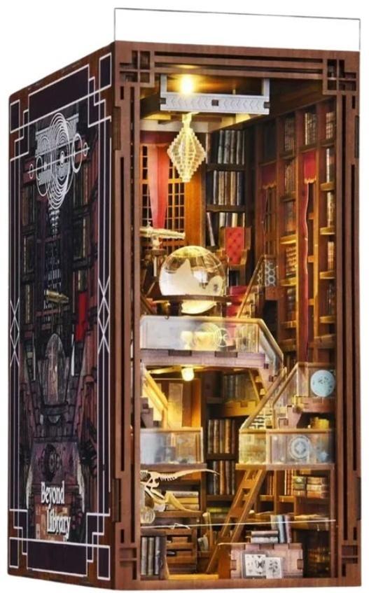 Miniaturowy domek "Biblioteka Odkrywcy"* Miniaturowy domek DIY do samodzielnego montażu typu Book Nook typ książkowy. Specyfikacja: Produkt składa się z gotowych, malowanych elementów drewnianych, umieszczonych na planszach składanie domku polega na umieszczeniu elementów drewnianych w otworach konstrukcji domku, wg kroków wskazanych w instrukcji. Część elementów papierowych (książek) wymaga wycięcia i sklejenia. Wymiary złożonego modelu: 11 cm (dł.), 18 cm (szer.), 23 cm (wys.). Model czterostronny, zamknięty. Materiał: drewno laserowo cięte elementy. Elementy papierowe w formie naklejek. Przycisk oświetlenia w górnej części modelu. Wysoka jakość nadruków (UV printing), z dbałością o szczegóły. ECO friendly. Ilość elementów: 520. Grubość elementów: 3 mm. Waga: 0.9 kg (waga z opakowaniem). Poziom trudności: 7/7 dla osób z doświadczeniem w składaniu puzzli 3D. Minimalny wiek: 14+. Produkt posiada certyfikat CE. Produkt jest zgodny z europejskimi normami: EN71-1, EN71-2, EN71-3. Opakowanie producenta. Wymiary opakowania: 20 cm (dł.), 5 cm (szer.), 29 cm (wys.). Skala modelu: 1:24. * przy nazwie oznacza produkt z osłoną przeciwkurzową w zestawie. W zestawie można znaleźć drobne elementy, które z łatwością mogą być połknięte przez młodsze dziecko. Zaleca się ostrożność przy składaniu domku w obecności dzieci poniżej trzeciego roku życia. Zawartość opakowania: żarówki LED, wszystkie materiały potrzebne do złożenia, zestaw podstawowych narzędzi z klejem, osłona antykurzowa (montowana od frontu), instrukcja obrazkowa. Zestaw nie zawiera baterii (2 baterii AAA) wymaganych do zasilenia żarówki LED. Wszystkie elementy są wycinane laserowo, mają gładkie powierzchnie, z namalowaną postacią, przedmiotem itp., którego dotyczy kształt.