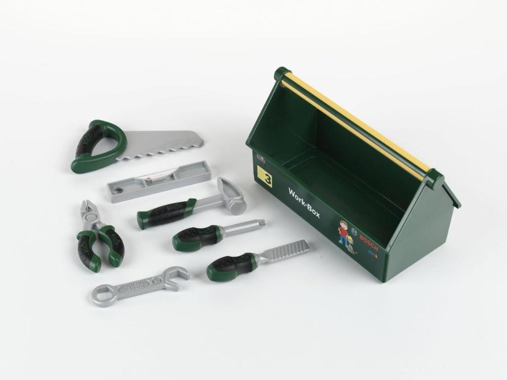 Skrzynka narzędziowa marki Klein pochodzi z serii zabawek Bosch mini powstałej na licencji firmy Bosch, dlatego też narzędzia wchodzące w jej skład są wiernymi kopiami faktycznie istniejących narzędzi tej marki. Zestaw zapakowany jest w ciemno-zieloną pojemną skrzynkę na narzędzia. Skrzynka posiada żółtą wygodną rączką oraz zawartość 7 elementów w komplecie. W zestawie znajduje się piła ręczna, młotek, kombinerki, pilnik i śrubokręt, narzędzia te mają ciemno-zielone rączki, gdzie ich wygodny uchwyt ma dodatkowo czarną profilowaną powierzchnię z logo Klein ułatwiającą utrzymanie narzędzia w dziecięcych dłoniach. Dodatkowo w zestawie znajduje się jeszcze srebrny oczkowy klucz płaski i poziomica. Wszystkie elementy zestawu są wykonane z plastiku, pozbawione ostrych krawędzi i całkowicie bezpieczne dla dziecka. Bawiąc się narzędziami skrzynki dzieci już od najmłodszych lat w bezpieczny sposób będą mogły wcielić się w rolę majsterkowicza, zapewniając sobie realistyczne doświadczenie korzystania z wszystkich jego narzędzi. Zestaw umożliwia maluchom kreatywną zabawę i doskonalenie umiejętności manualnych. Dzieci uwielbiają naśladować rodziców wykonujących codzienne czynności domowe lub w nich uczestniczyć, jednak nie zawsze jest to możliwe ze względów bezpieczeństwa, a dzięki tej całkowicie bezpiecznej dla dzieci, zabawkowej skrzynce narzędziowej każdy mały majsterkowicz może bezpiecznie robić to, co jego opiekunowie.