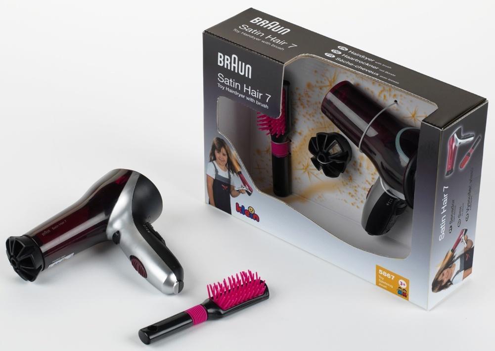 Suszarka powstała na licencji firmy Braun i dlatego wygląda jak prawdziwe urządzenie tej marki. Suszarka jest w kolorze czarnym z ciemno-różowymi oraz szarymi detalami. Posiada w zestawie miękką, wyprofilowaną szczotka oraz wymienną końcówkę. Suszarka po załączeniu baterii emituje cichy dźwięk działania silniczka oraz delikatnie dmucha chłodnym strumieniem powietrza. Zabawka została stworzona z myślą o dziewczynkach lubiących pielęgnowanie, suszenie i czesanie włosów. Zabawka jest nie tylko bezpieczna w użytkowaniu, ale sprawia również, że dziecko czuje się jakby korzystało z prawdziwej suszarki. Niemiecka firma Klein specjalizuje się w tworzeniu zabawek na licencji. Małe, plastikowe zabawki wyglądają niczym prawdziwe, elektroniczne urządzenia codziennego użytku. Zabawka wymaga użycia baterii, które nie są zawarte w zestawie.