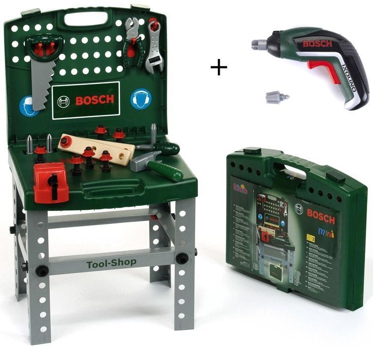 Warsztat marki Klein pochodzi z serii zabawek Bosch mini powstałej na licencji firmy Bosch, dlatego też narzędzia wchodzące w jego skład są wiernymi kopiami faktycznie istniejących narzędzi tej marki. W zestawie zapakowanym w ciemno zieloną walizkę z wygodną rączką i dwoma zamkami zabezpieczającymi przed niechcianym otwarciem, znajdziemy 25 elementów konstrukcyjnych i narzędzi do zabawy. Po otwarciu w komplecie jest zestaw czterech srebrnych i stabilnych nóg, na których układa się otwartą walizkę, która stanowi blat i jednocześnie tylną ścianę warsztatu. Walizka jest zarówno opakowaniem transportowym tego warsztatu, jak również po otwarciu i złożeniu stanowi kompletny warsztat z narzędziami i wkrętarką Ixiolino II do zabawy. Narzędzia będące częścią tego warsztatu to czerwone imadło, młotek, kombinerki, piła, śrubokręt z dwiema końcówkami i klucz francuski. Zabawki te mają ciemno-zielone rączki, a ich wygodny uchwyt ma dodatkowo czarną profilowaną powierzchnię z logo Klein ułatwiającą utrzymanie narzędzia w dziecięcych dłoniach. Ponadto w zestawie znajduje się bezprzewodowa wkrętarka Ixiolino II. Wkrętarka jest solidnie wykonana z dużą dbałością o szczegóły, ma dwie wymienne końcówki śrubokręta, przez co wiernie naśladuje prawdziwe urządzenie. Zabawka jak prawdziwa ma uchwyt z gumową powierzchnią ułatwiającą utrzymanie zabawki, ma możliwość przełączenia za pomocą czerwonego przesuwaka obrotu końcówki w prawo i w lewo, a także diodę podświetlającą miejsce wkręcania, zamieszczoną nad bitem. Wszystkie elementy zestawu są wykonane z plastiku, pozbawione ostrych krawędzi i całkowicie bezpieczne dla dziecka. Zestaw został stworzony z dbałością o szczegóły i detale z wysokiej jakość materiałów, przez co wiernie naśladuje prawdziwe narzędzia i będzie służyć dzieciom przez długi czas. Dzięki warsztatowi walizkowemu dzieci w bezpieczny sposób będą mogły wcielić się w rolę majsterkowicza, zapewniając sobie realistyczne doświadczenie korzystania z wszystkich jego narzędzi, przy zachowaniu bardzo niewielkich rozmiarów transportowych złożonej zabawki. Dzieci uwielbiają naśladować rodziców wykonujących codzienne czynności domowe lub w nich uczestniczyć, jednak nie zawsze jest to możliwe ze względów bezpieczeństwa, a dzięki temu całkowicie bezpiecznemu dla dzieci, zabawkowemu warsztatowi walizkowemu z narzędziami każdy mały majsterkowicz może bezpiecznie robić to, co jego opiekunowie. Zabawka wymaga użycia baterii, które nie są zawarte w zestawie.