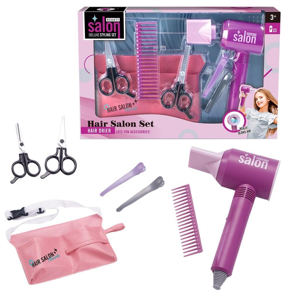 Zestaw fryzjerski składający się z wielu elementów: suszarki, torebki na drobiazgi przyczepianej w pasie, dwóch par nożyczek, grzebienia oraz dwóch spinek. Suszarka wymaga baterii: 3xAAA (niedołączone)