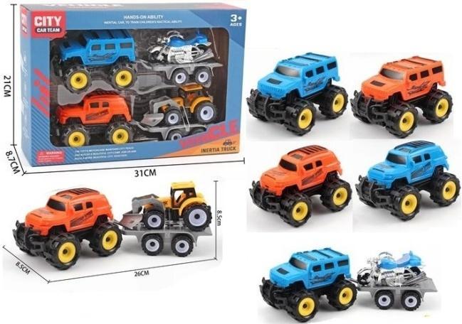 Odkryj niezwykły zestaw samochodów terenowych City Car Team Inertia Truck, który zapewni godziny ekscytującej zabawy każdemu dziecku powyżej 3 roku życia. W tym podwójnym zestawie znajdują się dwa imponujące monster trucki z gigantycznymi kołami, jeden w jaskrawym kolorze niebieskim, a drugi w energetycznym pomarańczowym. Każdy monster truck ma dołączoną lawetę transportową z dodatkowym ładunkiem. Pomarańczowy pojazd ciągnie lawetę z realistycznie wyglądającym żółtym traktorem budowlanym, podczas gdy niebieski monster truck transportuje lawetę z dynamicznym motocyklem. Wszystkie pojazdy wyposażone są w wygodny w obsłudze napęd inercyjny, wystarczy je pchnąć, aby ruszyły do przodu, co wspiera rozwój koordynacji ręka-oko i umiejętności manualnych u najmłodszych. Pojedynczy zestaw z lawetą, na przykład pomarańczowy monster truck z traktorem, ma długość około 26 centymetrów. Jest to wspaniała propozycja dla przyszłych kierowców i budowniczych, łącząca zabawę w wyścigi i transport.