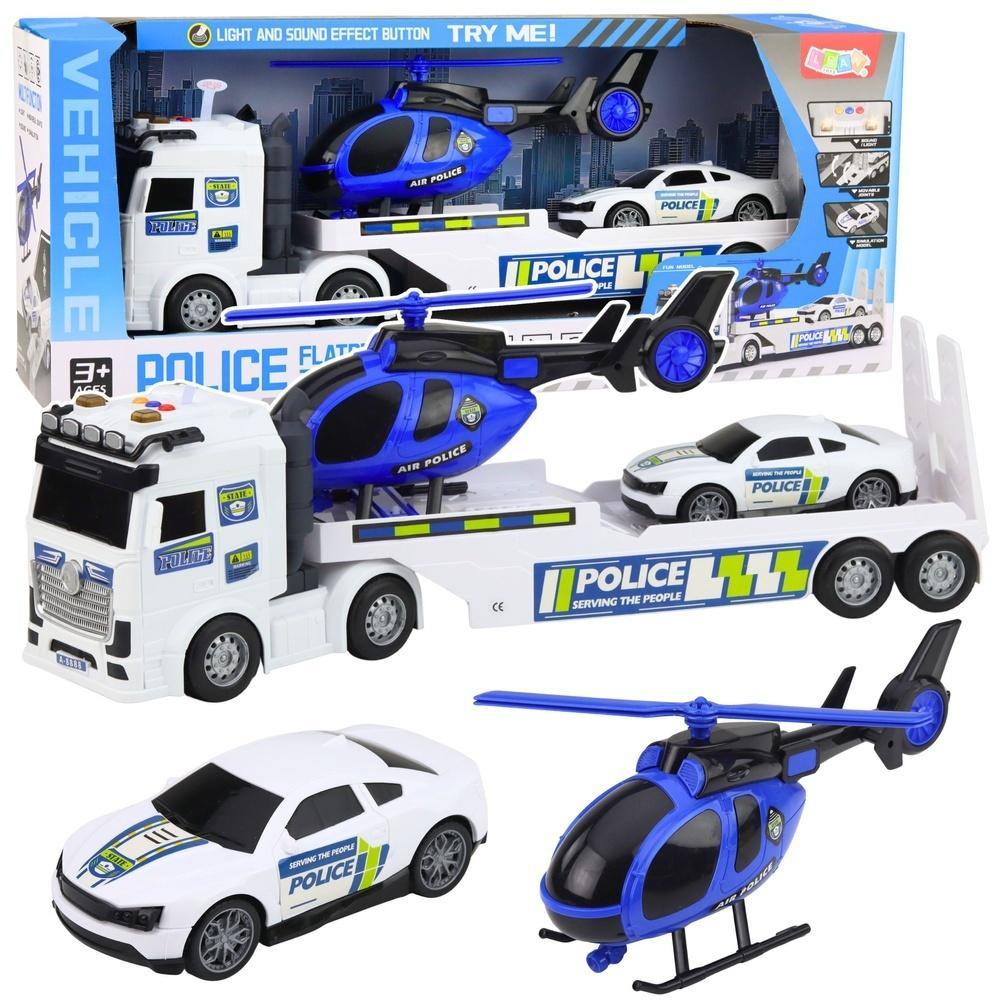 ZESTAW POLICYJNY CIĘŻARÓWKA LAWETA HELIKOPTER AUTO ŚWIATŁA DŹWIĘK