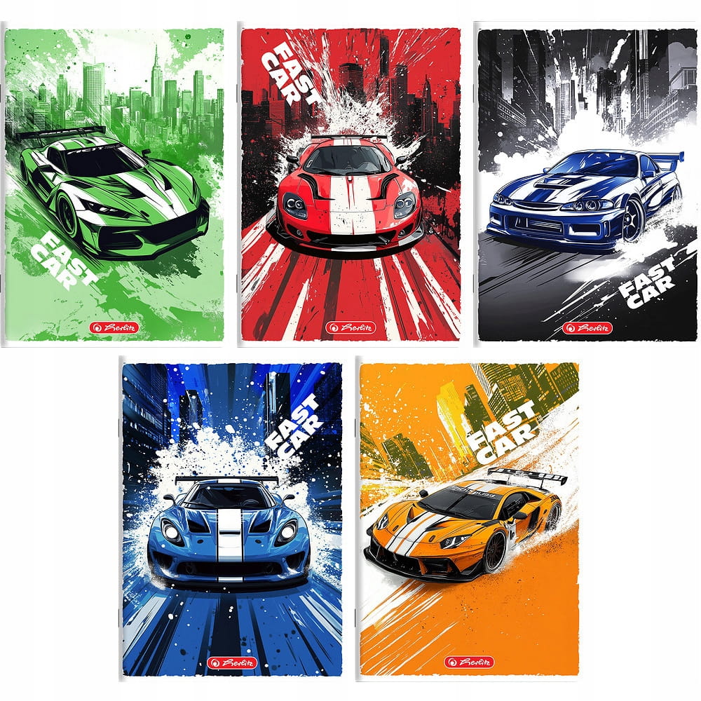 - Ilustracje z wyścigowymi samochodami nadają zeszytom dynamicznego charakteru